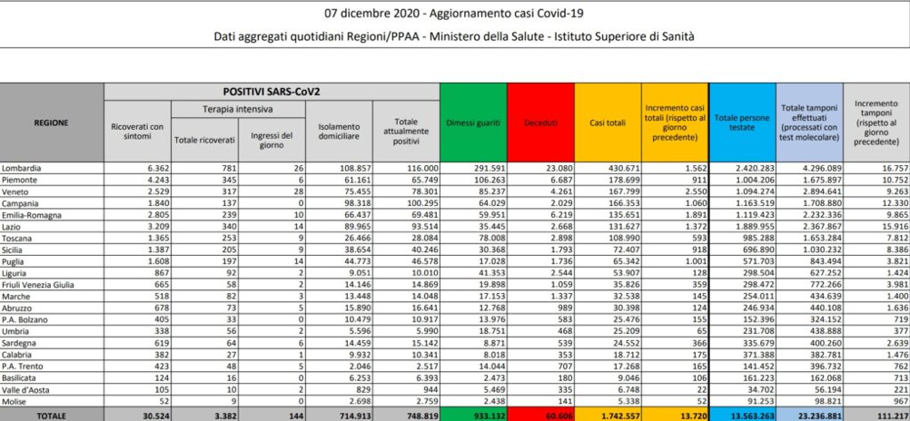 Negli ospedali la situazione è la seguente: in terapia intensiva ci sono 3.382 pazienti (-72), in degenza ordinaria dopo giorni di flessione continuano ad aumentare i ricoveri. Attualmente ci sono 30.524 pazienti (+133). Il numero delle persone in isolamento domiciliare è di 714.913.