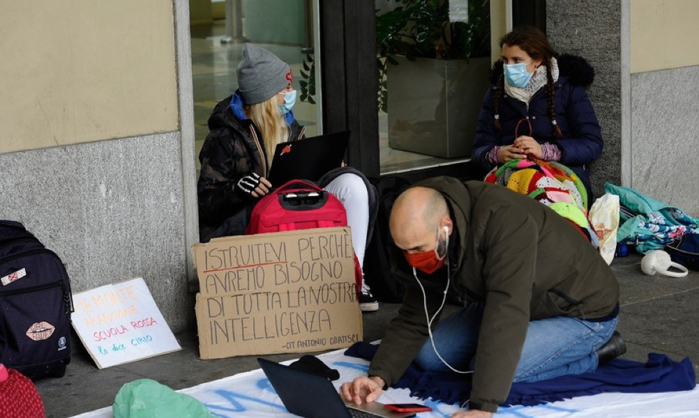 “È una protesta simbolica – aggiunge – perché continuo normalmente a fare lezione a distanza, ma anziché stare a casa al caldo, lavoro seduto a terra qui, in piazza Castello, insieme a mia figlia e agli altri ragazzi. Lo faccio perché la questione è diventata politica e non di emergenza sanitaria”. Insegnante di fotografia e cinema all’Istituto superiore Bodoni Paravia di Torino, Rogliatti ha un obiettivo: “tenere accesa l’attenzione anche sulla scuola superiore, che viene troppo spesso dimenticata”.