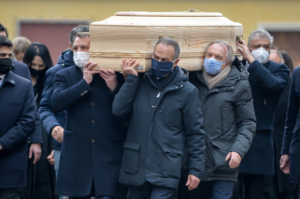 Marco Tardelli e Antonio Cabrini in testa, dietro Giancarlo Antognoni e via via tutti gli altri: da Alessandro Altobelli a Fulvio Collovati, Franco Causio, Lele Oriali, Beppe Dossena, Daniele Massaro, Beppe Bergomi, Franco Baresi e Giovanni Galli. Con loro anche Alessandro, primo figlio, 38 anni, di Rossi, avuto dalla prima moglie dell’attaccante. Sulla bara una maglia azzurra numero 20 e una sciarpa del Vicenza. Presente anche il presidente della FIGC Gabriele Gravina. Applausi e cori (“Paolo, Paolo”) hanno accolto l’emozionante arrivo del feretro. Circa 300 persone del Duomo, tra cui anche il sindaco di Vicenza Francesco Rucco e Roberto Baggio, altro grande campione vicentino oltre che Pallone d’Oro italiano. La salma sarà cremata dopo la funzione e riportata a Bucine, in provincia di Arezzo,