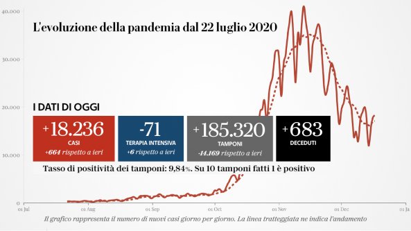 Oggi il bollettino del ministero della Sanità registra 18.236 nuovi casi di coronavirus (su 185.320 tamponi eseguiti) e 683 morti. Ieri i contagi sono stati 17.572 (con 199.489 tamponi), i morti 680. Nelle ultime 24 ore quindi il rapporto positivi-tamponi si attesta al 9,8 per cento.