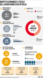 Quello del lavoro domestico, tuttavia, è un settore tutt’altro che marginale. I calcoli di Domina parlano infatti di 7,1 miliardi di euro di spesa delle famiglie per i lavoratori regolari e 8 miliardi per quelli in “nero”. Un totale di 15,1 miliardi che genera un gettito fiscale diretto di 1,5 miliardi (potenzialmente di 3,6), un valore aggiunto di 17,9 miliardi, pari all’1,1% del Pil italiano. Ma ancora più importante è il risparmio che le famiglie assicurano allo Stato con l’assistenza agli anziani non autosufficienti: ben 10,9 miliardi l’anno. Se un milione circa di ultra ottantenni e disabili venissero invece ricoverati, infatti, la spesa pubblica salirebbe da 22,1 a 33 miliardi di euro (pur scontando il risparmio delle relative indennità di accompagnamento).