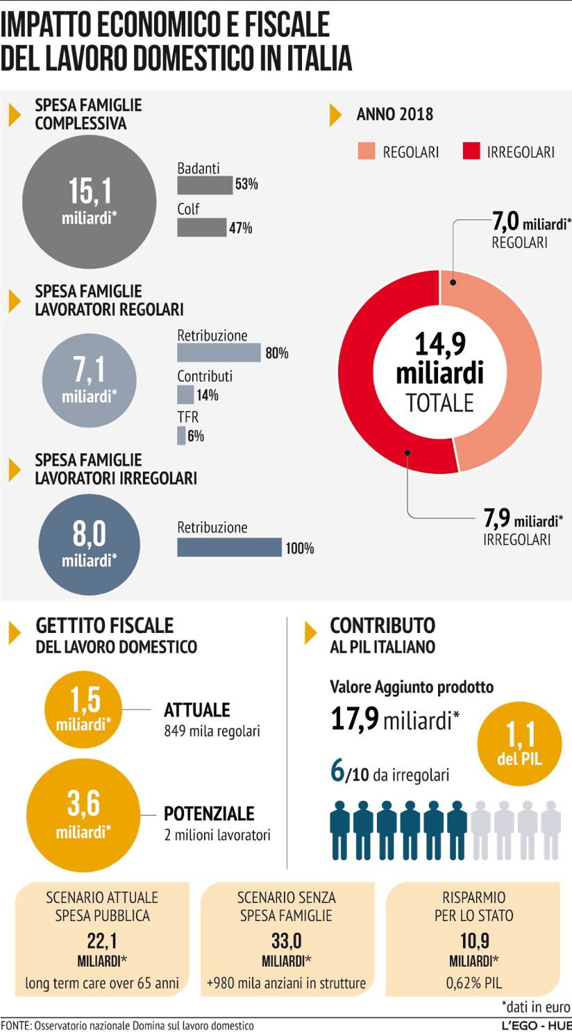 Quello del lavoro domestico, tuttavia, è un settore tutt’altro che marginale. I calcoli di Domina parlano infatti di 7,1 miliardi di euro di spesa delle famiglie per i lavoratori regolari e 8 miliardi per quelli in “nero”. Un totale di 15,1 miliardi che genera un gettito fiscale diretto di 1,5 miliardi (potenzialmente di 3,6), un valore aggiunto di 17,9 miliardi, pari all’1,1% del Pil italiano. Ma ancora più importante è il risparmio che le famiglie assicurano allo Stato con l’assistenza agli anziani non autosufficienti: ben 10,9 miliardi l’anno. Se un milione circa di ultra ottantenni e disabili venissero invece ricoverati, infatti, la spesa pubblica salirebbe da 22,1 a 33 miliardi di euro (pur scontando il risparmio delle relative indennità di accompagnamento).