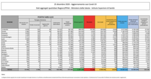 Anche nel giorno di Natale paga un alto tributo di vite umane di fronte all’epidemia di Coronavirus. I decessi registrati nelle ultime 24 ore, come evidenzia il bollettino odierno diffuso dalla Protezione civile e dal Ministero della Salute, sono 459, in calo rispetto ai 505 di giovedì, per un totale di 71.359 vittime. Dall’inizio del monitoraggio sono ormai 2.028.354 le persone che hanno contratto il virus, oltre 19mila nelle sole ultime 24 ore (oggi 19.037, ieri erano 18.040).