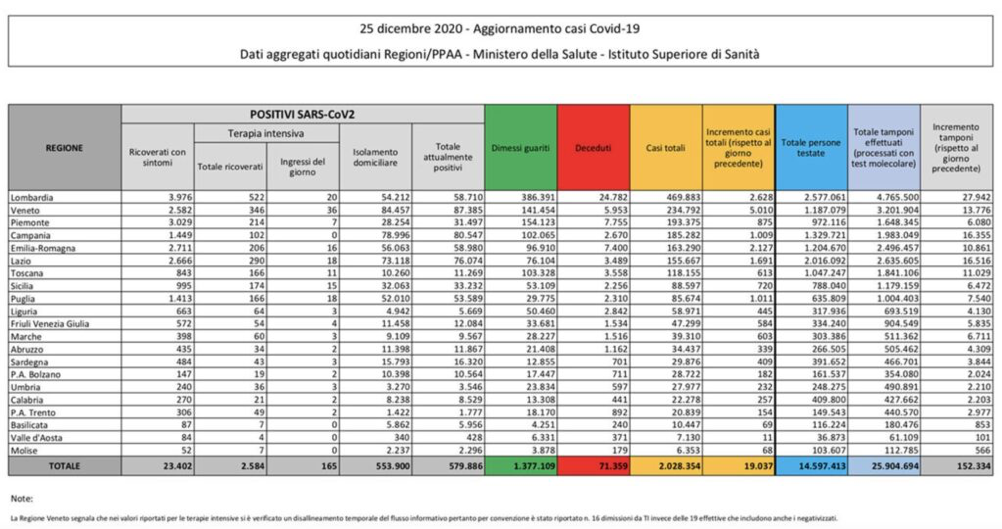Complessivamente sono 1.377.109 le persone dimesse o guarite: di queste 32.324 lo sono rispetto al dato di ieri. Quanto ai tamponi, quelli processa ti nelle ultime 24 ore sono 152.334, ben 44mila in meno rispetto ai 193.777 della vigilia di Natale. Il tasso di positività risale al 12,5% contro il 9,3% di giovedì: ciò vuol dire che su 100 tamponi eseguiti poco più di 12 sono risultati positivi.
