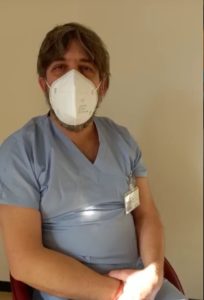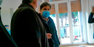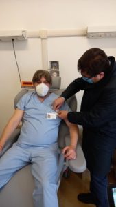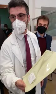 Mauro Negretti, noto operatore dell’ospedale e coordinatore DAPS, è stato il primo ad essere vaccinato, nel corollario di una breve ma suggestiva manifestazione.