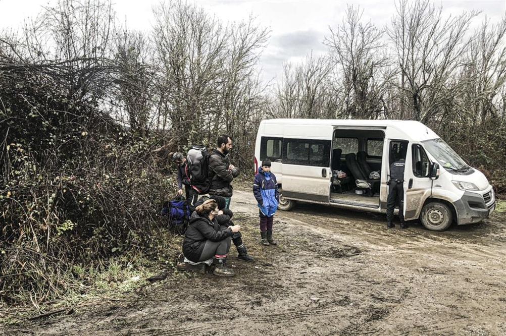 Mentre ci implora di tenerci alla larga dal sentiero e tornare indietro il prima possibile, il suo sguardo cade dietro al furgone bianco del commissariato. Accovacciati su dei sassi ci sono due donne, due uomini e un bambino. Sono stati catturati pochi minuti prima da una squadra in tenuta antisommossa, poi tornata nella foresta per dare la caccia ad altri irregolari.
