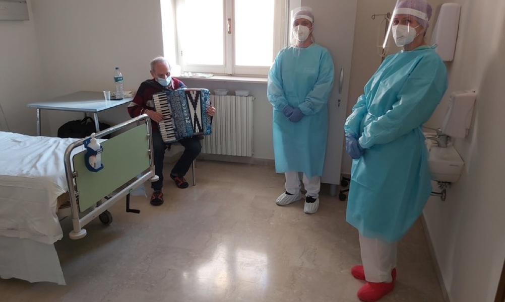 Alcuni operatori sanitari per tenere alto lo spirito si sono esibiti un una mazurka improvvisata. E non mancano gli applausi al fisarmonicista al termine delle suonate. Il centro di Cortemaggiore ospita persone positive al Covid (22 persone è la capienza massima) che non possono trascorrere il periodo di isolamento al proprio domicilio perché non completamente autosufficienti.