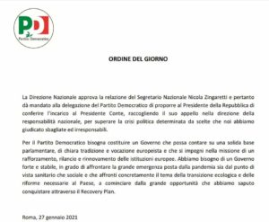 La Direzione nazionale del PD ha deciso, unanimemente, la linea da seguire per le consultazioni con il Presidente della Repubblica, e per superare la crisi con la formazione di un governo – guidato da Conte – di chiara ispirazione europeista