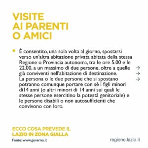 👨👩👦 VISITE A PARENTI E AMICI: consentita una sola visita al giorno. Possono spostarsi massimo 2 persone oltre a eventuali figli minori di 14anni e persone con disabilità (che sono escluse dal conteggio).