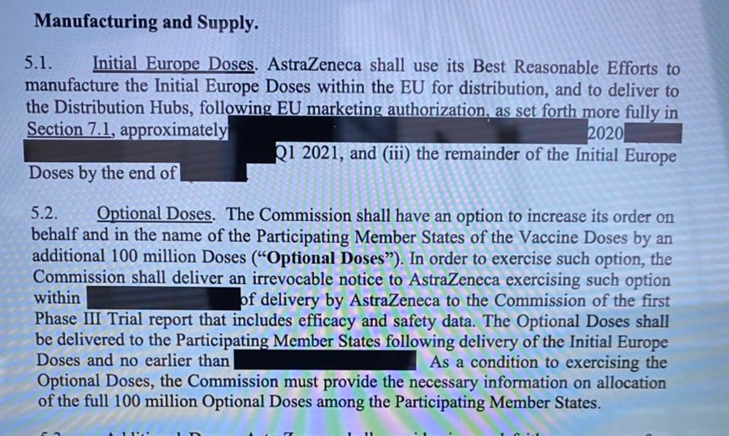 “Su richiesta della Commissione europea, AstraZeneca ha deciso di pubblicare una versione del contratto” sulla fornitura di vaccini all’Ue, ha annunciato il portavoce della Commissione, Eric Mamer.