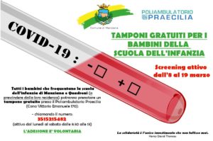 Dall’8 al 19 marzo i genitori che lo vorranno potranno prenotare per i propri figli un tampone gratuito presso il Poliambulatorio Praecilia (Corso Vittorio Emanuele 170): lo screening gratuito riguarderà i bambini che da normativa non sono tenuti ad utilizzare la mascherina.