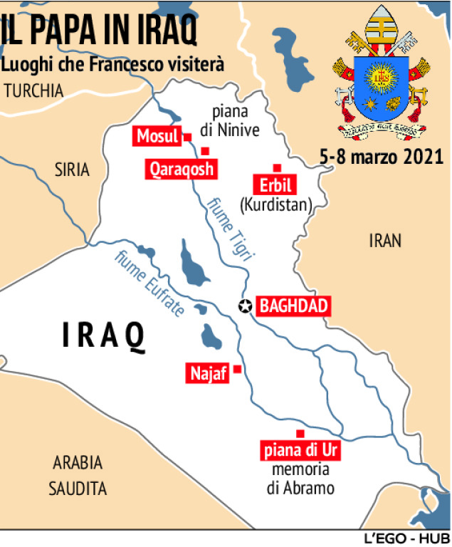 Baghdad, la città sacra dell’islam sciita Najaf, a Ur dei caldei, poi Erbil nella regione autonoma del Kuridistan iracheno, Mosul, Qaraqosh nella piana di Ninive, abitate dai cristiani, queste le tappe simbolo del viaggio in Iraq nel quale il Papa pronuncerà quattro discorsi e terrà due omelie, un Angelus e una preghiera di suffragio per le vittime della guerra.