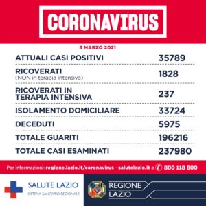 “Oggi su oltre 14 mila tamponi nel Lazio (3.153) e quasi 23 mila antigenici per un totale di oltre 37 mila test, si registrano 1.520 casi positivi (+332), 35 i decessi (+6) e +1.491 i guariti. Diminuiscono i ricoveri, mentre aumentano i casi, i decessi e le terapie intensive. Il rapporto tra positivi e tamponi è a 10%, ma se consideriamo anche gli antigenici la percentuale è al 4%. I casi a Roma città sono a quota 600. La curva dei casi è in ascesa, mantenere rigore nei comportamenti. Nella Asl Roma 1 sono 324 i casi nelle ultime 24h e si tratta di casi isolati a domicilio o con link familiare o contatto di un caso già noto. Sono diciassette i ricoveri. Si registrano nove decessi con patologie. Nella Asl Roma 2 sono 221 i casi nelle ultime 24h e si tratta di casi isolati a domicilio o con link familiare o contatto di un caso già noto. Sono sessantotto i casi su segnalazione del medico di medicina generale. Si registrano undici decessi con patologie. Nella Asl Roma 3 sono 98 i casi nelle ultime 24h e si tratta di casi isolati a domicilio o con link familiare o contatto di un caso già noto. Si registrano due decessi con patologie. Nella Asl Roma 4 sono 101 i casi nelle ultime 24h e si tratta di casi isolati a domicilio o con link familiare o contatto di un caso già noto. Si registrano due decessi con patologie. Nella Asl Roma 5 sono 95 i casi nelle ultime 24h e si tratta di casi isolati a domicilio o con link familiare o contatto di un caso già noto. Si registrano tre decessi con patologie. Nella Asl Roma 6 sono 164 i casi nelle ultime 24h e si tratta di casi isolati a domicilio o con link familiare o contatto di un caso già noto. Si registrano due decessi con patologie. Nelle province si registrano 517 casi e sono sei i decessi nelle ultime 24h. Nella Asl di Latina sono 150 i nuovi casi e si tratta di casi isolati a domicilio o con link familiare o contatto di un caso già noto. Nella Asl di Frosinone si registrano 249 nuovi casi e si tratta di casi isolati a domicilio, contatti di un caso già noto o con link familiare. Si registrano quattro decessi di 63, 64, 87 e 88 anni con patologie. Nella Asl di Viterbo si registrano 79 nuovi casi e si tratta di casi isolati a domicilio o con link familiare o contatto di un caso già noto. Nella Asl di Rieti si registrano 39 nuovi casi e si tratta di casi isolati a domicilio o con link familiare o contatto di un caso già noto. Si registrano due decessi di 60 e 75 anni con patologie”