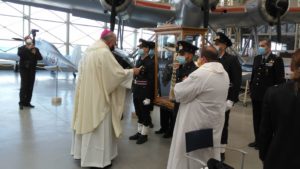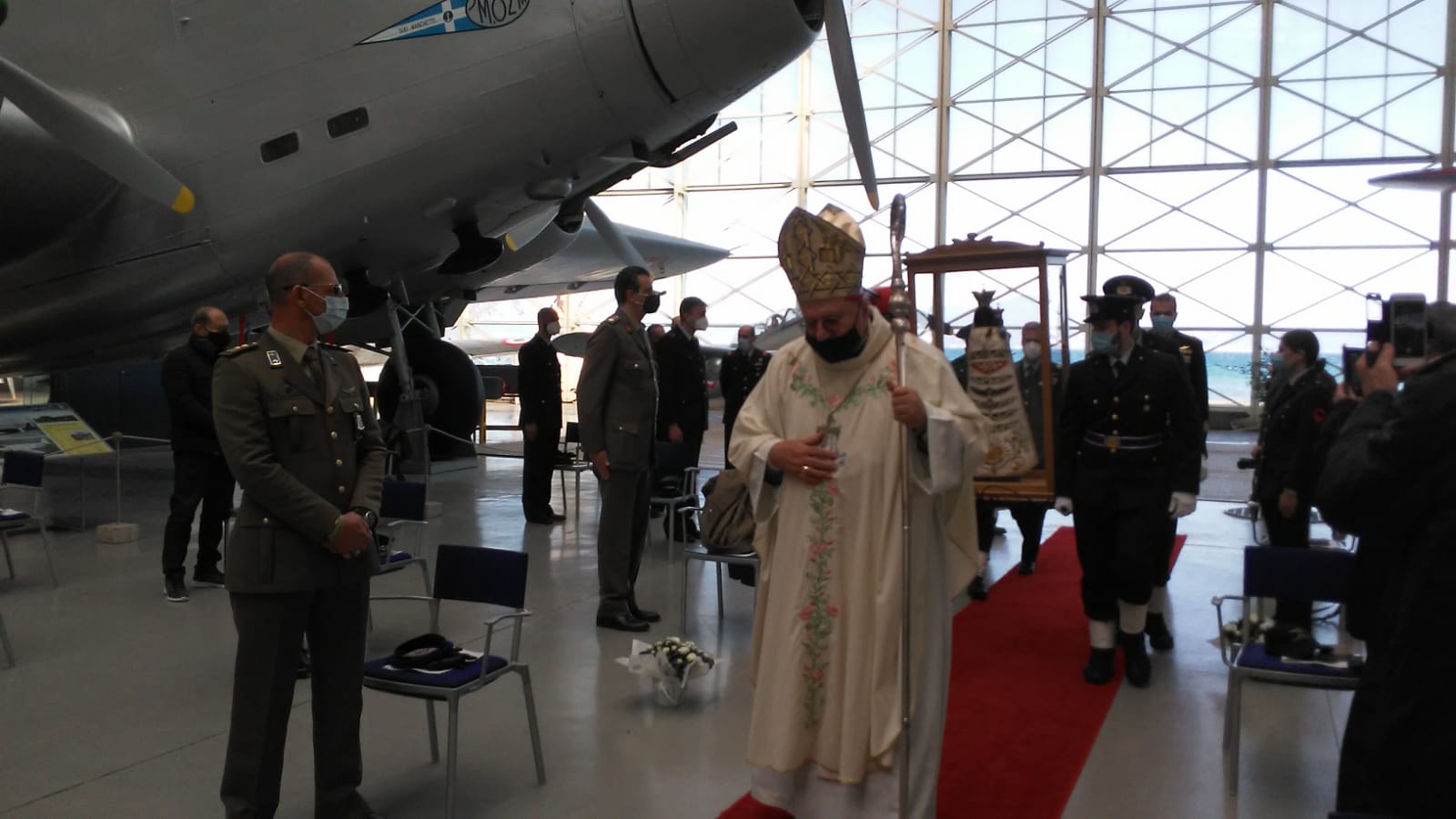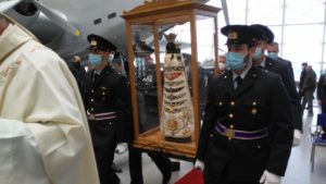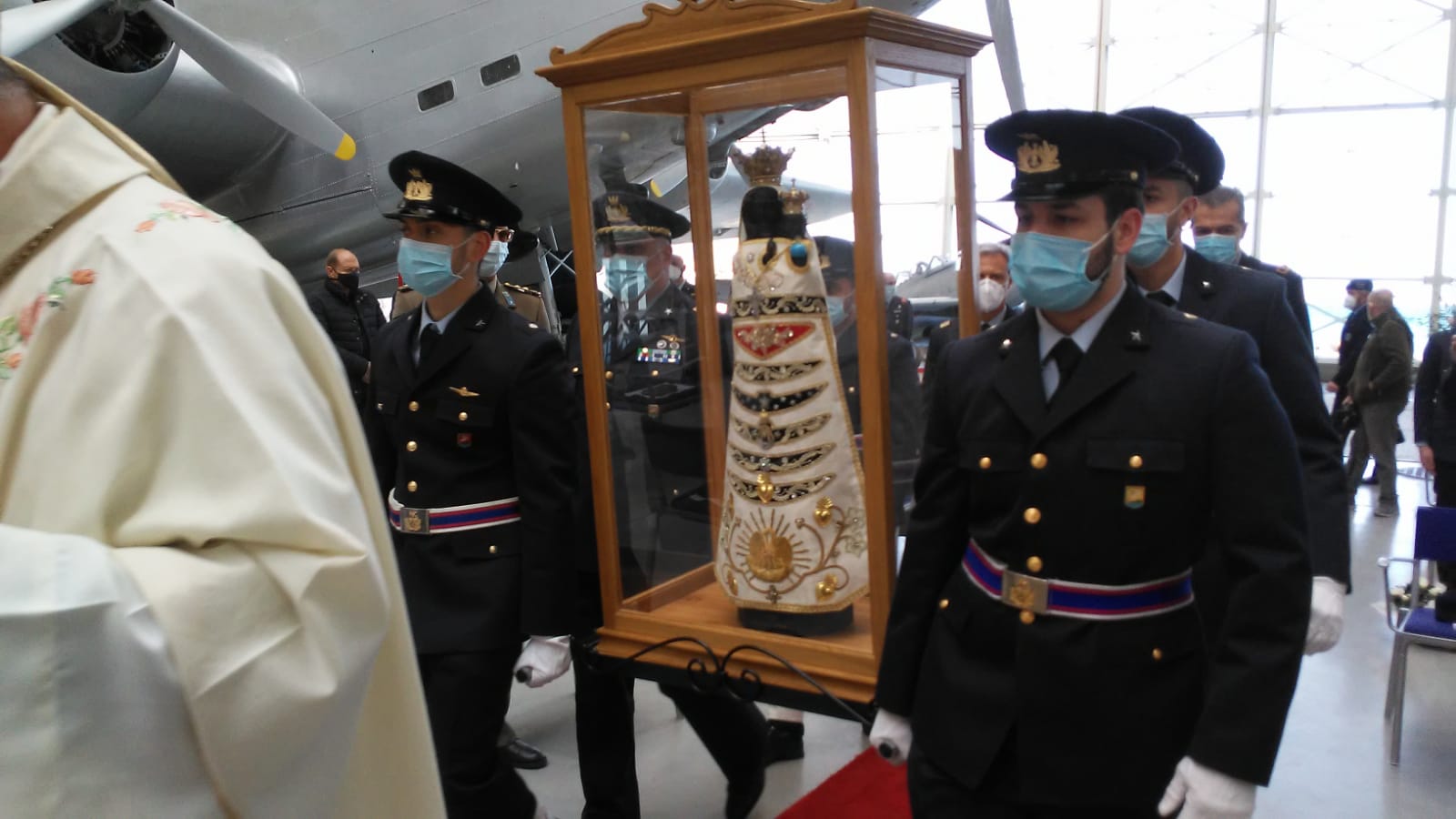 Giornata indimenticabile per l’Aeronautica italiana, l’effige itinerante della Madonna di Loreto è stata elitrasportata nella sede della “Luigi Bourlot” di Vigna di Valle, oggi sede del Centro Sportivo e del Museo Storico dell’Aeronautica Militare. La statua, contenuta in una teca di rovere e vetro appositamente realizzata per l’occasione, è stata venerata con una cerimonia religiosa officiata dal Vescovo della Diocesi di Civita Castellana, Monsignor Romano Rossi. Prima della cerimonia la Madonna, a bordo di un elicottero, ha sorvolato i cieli di Anguillara, Trevignano, Bracciano e Manziana, per una benedizione speciale. Presenti per accogliere la sacra effige il Generale di Divisione Sergio Scalese e il Comandante della Base, il Colonnello Rosario D’Auria, oltre al Ten.Col. Adelio Roviti Direttore del Museo. Presenti i sindaci dei paesi sorvolati dalla Madonna, il Direttore del Parco Bracciano-Martignano Daniele Badaloni, oltre a rappresentanze militari, civili e religiose – il Cappellano Don Fausto e Don Donelio Parroco di Vigna di Valle – dei comuni del circondario. L’evento rappresenta una delle iniziative per le celebrazioni del Giubileo Lauretano, concesso da Papa Francesco in occasione del Centenario dalla proclamazione della Virgo Lauretana a “Aeronautarum Patrona”, patrona degli aviatori, iniziato ufficialmente l’8 dicembre 2019 con l’apertura della Porta Santa del Santuario di Loreto, e che si concluderà il 10 dicembre 2021.