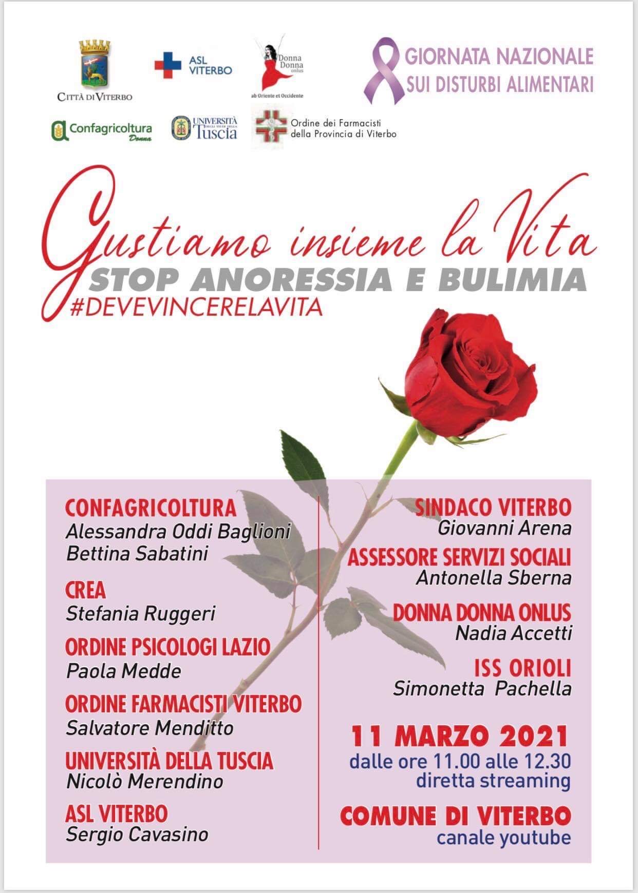 Gustiamo insieme la vita. Stop anoressia e bulimia. Deve vincere la vita. Questo il messaggio chiaro, forte e deciso che verrà lanciato e ribadito oggi in occasione della Giornata nazionale sui disturbi alimentari. L’importante tematica sarà infatti al centro dell’evento in programma dalle 11 alle 12,30, in diretta streaming sul canale YouTube del Comune di Viterbo (e sulla pagina Fb Comune di Viterbo Informa).