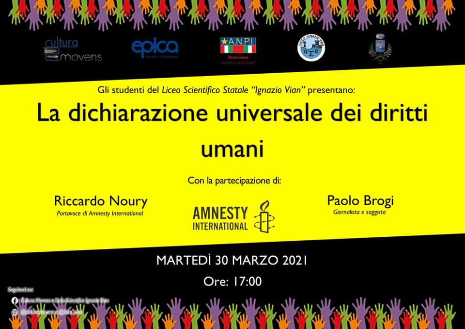 Martedì 30 marzo 2021 alle ore 17 è stato trasmesso un incontro in diretta con il portavoce internazionale di Amnesty International Riccardo Noury e il giornalista e saggista Paolo Brogi.