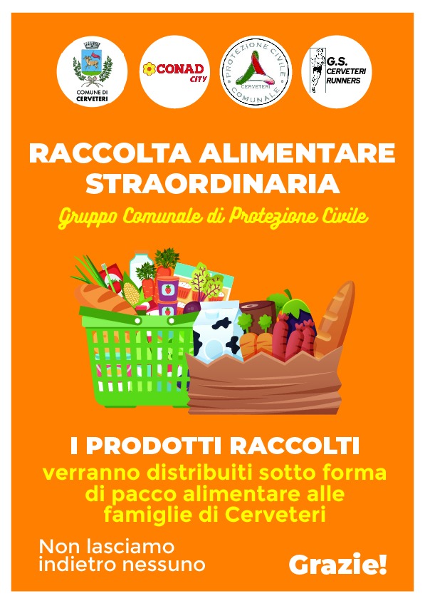 Solidarietร nuovamente protagonista sabato 17 aprile a Cerveteri. I Volontari del Gruppo Comunale di Protezione Civile di Cerveteri insieme agli atleti e le atlete della G.S. Cerveteri Runners di Loredana Ricci saranno infatti impegnati in una doppia raccolta di generi alimentari di prima necessitร davanti due importanti supermercati della cittร . I primi, saranno davanti al Supermercato Carrefour in Largo A. Loreti n.2, gli altri davanti il Supermercato CONAD CITY in Largo Almuneacar.