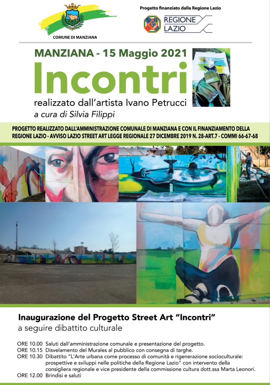 Sabato 15 maggio, a partire dalle ore 10, in piazza Parisi (già piazza della Piscina) verrà inaugurata l’opera di street art “Incontri”, dell’artista Ivano Petrucci, progetto presentato dal Comune di Manziana e finanziato dalla Regione Lazio grazie all’avviso Lazio Street Art Legge Regionale 27 dicembre 2019, n.28 – art.7- commi 66-67-68.