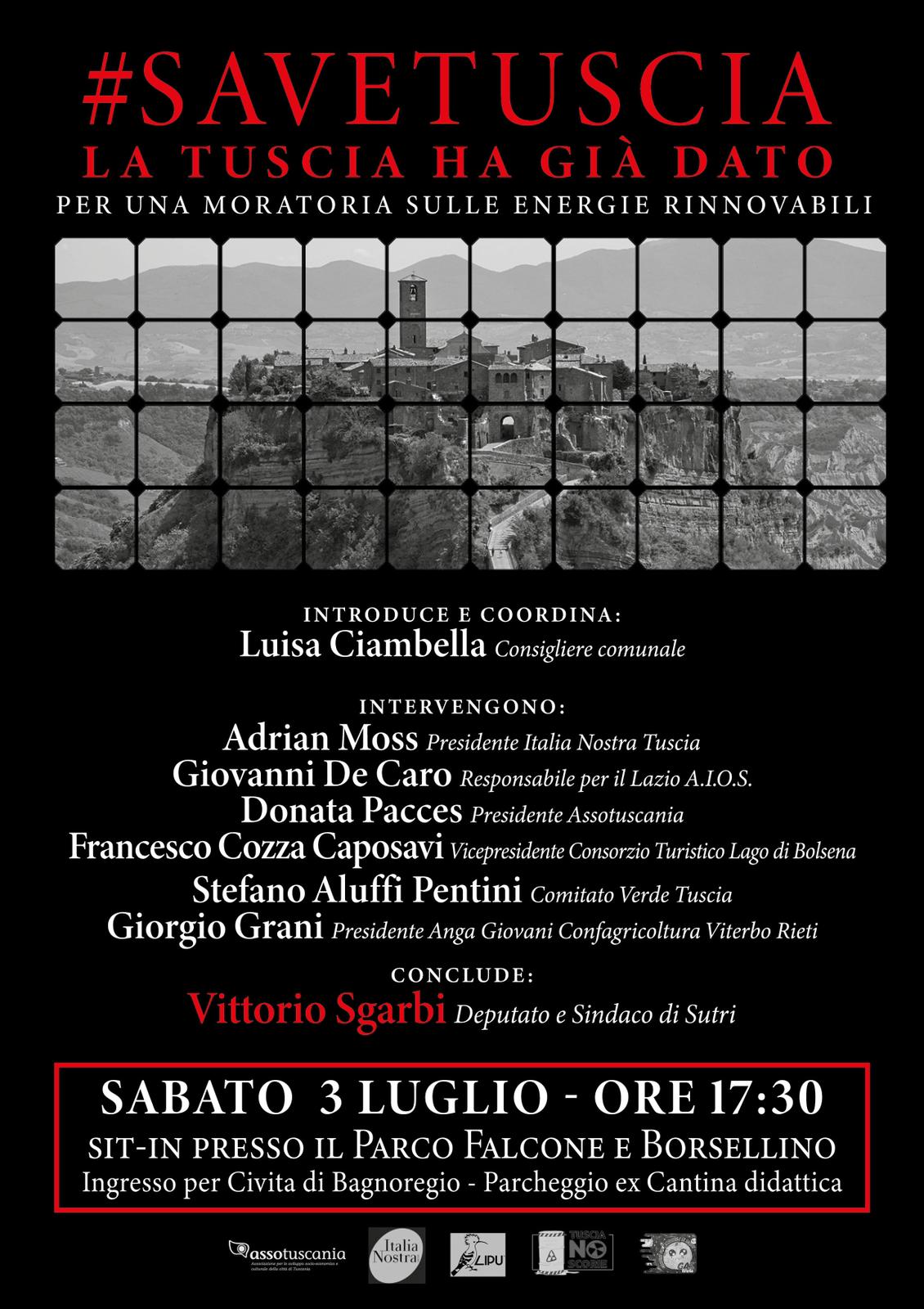 Dopo il sit-in intitolato #saveFERENTO per dire no alla realizzazione di un maxi impianto fotovoltaico vicino all’area archeologica etrusco-romana, il 3 luglio alle ore 17:30 al Belvedere di Civita di Bagnoregio (Parco Falcone e Borsellino) si svolgerà #saveTUSCIA, una nuova iniziativa per sottolineare la necessità di preservare la bellezza e le caratteristiche naturali e rurali della nostra terra, posta sotto assedio da una miriade di impianti di energie rinnovabili non integrate. Un vero e proprio piano di trasformazione industriale radicale della Tuscia all’insaputa della popolazione, laddove il suolo è una risorsa non rinnovabile. Si è scelto come sfondo quello di Civita perché l’antico borgo rappresenta una icona della bellezza della Tuscia e anche perché sull’area tra Bagnoregio e il lago di Bolsena esiste il rischio imminente di veder sorgere numerose pale eoliche (aerogeneratori industriali) che stravolgerebbero completamente il paesaggio.