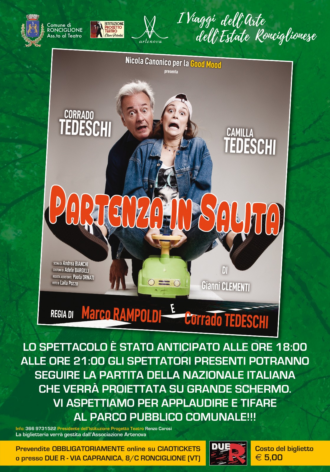 Prende il via il 2 luglio con Corrado e Camilla Tedeschi la prima edizione de “I viaggi dell’arte dell’estate ronciglionese”, rassegna culturale promossa dal Comune di Ronciglione in collaborazione con l’associazione culturale Artenova. «Nonostante l’epidemia abbia profondamente colpito il mondo della cultura, sospendendo improvvisamente varie attività culturali che da sempre venivano promosse dal Comune di Ronciglione – racconta Manuela Giorgetti, assessore con delega al teatro, al commercio e politiche giovanili – il sindaco Mario Mengoni ha promosso l’iniziativa, una rassegna di spettacoli dal vivo da offrire alla cittadinanza locale, ma anche a tutti i turisti che ogni anno “affollano” piacevolmente la strade del nostro borgo medievale che gode di un’invidiabile posizione geografica e climatica e che negli ultimi anni ha sviluppato le attività inerenti al turismo valorizzando in particolare il patrimonio ambientale del Lago di Vico e le proprie tradizioni gastronomiche e culturali». Per la cronaca Corrado e Camilla Tedeschi portano in scena uno spettacoli di Gianni Clementi, “Partenza in salita”, e i due saliranno per la prima volta insieme sul palcoscenico. Appuntamento alle 18 al parco comunale di Ronciglione, a seguire maxischermo per “vivere” insieme la sfida dell’Europeo di calcio fra l’Italia e il Belgio.