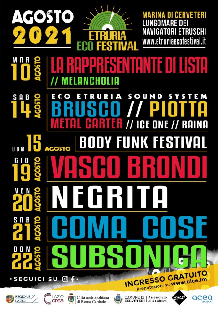 Cerveteri, Etruria Eco Festival 15: Subsonica, Negrita, Vasco Brondi, La Rappresentante di Lista e Coma_Cose