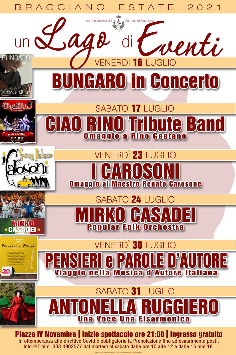 Da Venerdì 16 luglio tanti appuntamenti con l’intrattenimento, la musica, i cantautori e artisti di qualità a Bracciano. Il Comune di Bracciano ha organizzato il mese ricco di eventi: “Siamo lieti – ha dichiarato il Sindaco di Bracciano Armando Tondinelli – di presentare sei imperdibili appuntamenti con manifestazioni di rilievo che animeranno la nostra bella città. Anche quest’anno Bracciano vola alto e ringrazio l’Assessore alla Cultura Claudia Marini e il direttore artistico Antonio Pizzolla per l’impegno nel mantenere alto il livello