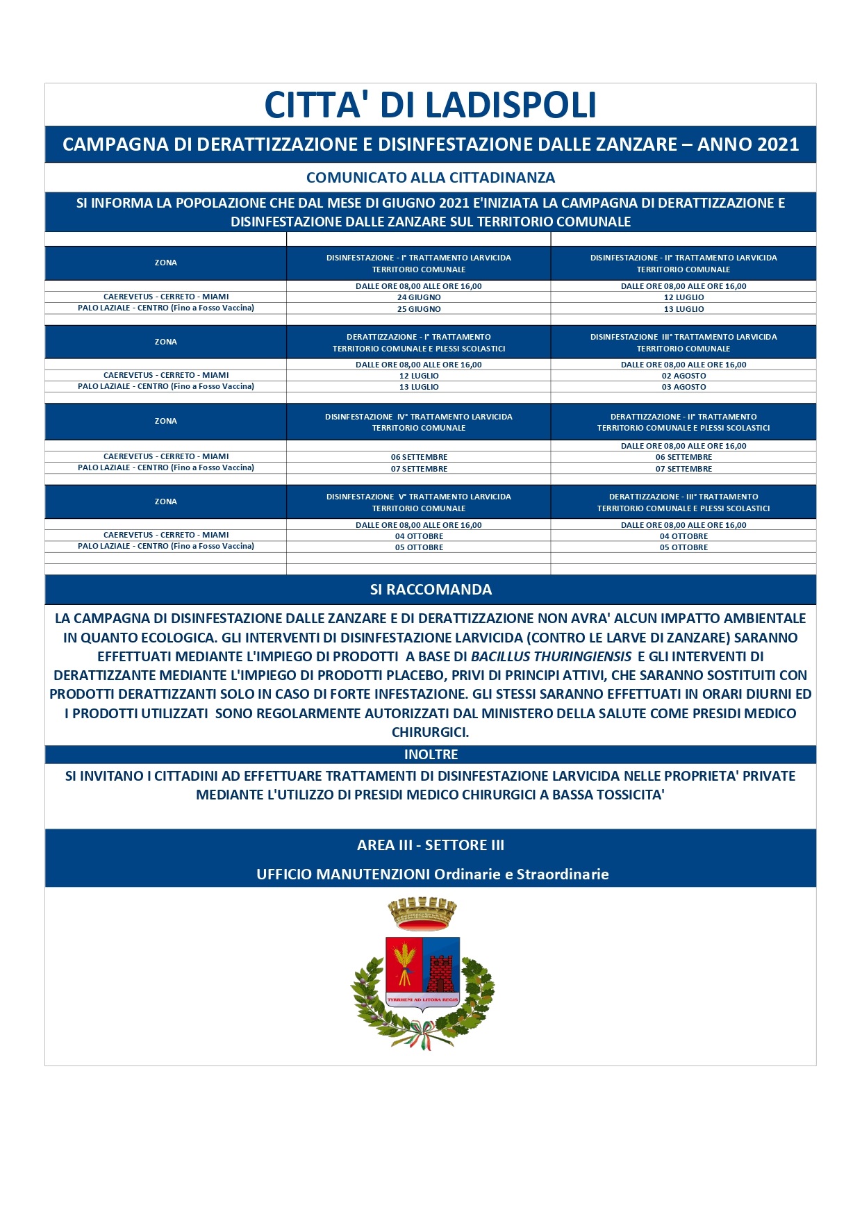 L’Amministrazione comunale informa che la campagna di disinfestazione dalle zanzare e di derattizzazione non avrà alcun impatto ambientale in quanto ecologica. Gli interventi di disinfestazione larvicida (contro le larve di zanzare) sono effettuati mediante l’impiego di prodotti a base di Bacillus thuringiensis e gli interventi di derattizzante mediante l’impiego di prodotti placebo, privi di principi attivi, che saranno sostituiti con prodotti derattizzanti solo in caso di forte infestazione. Gli stessi sono effettuati in orari diurni ed i prodotti utilizzati sono regolarmente autorizzati dal Ministero della Salute come presidi medico chirurgici.