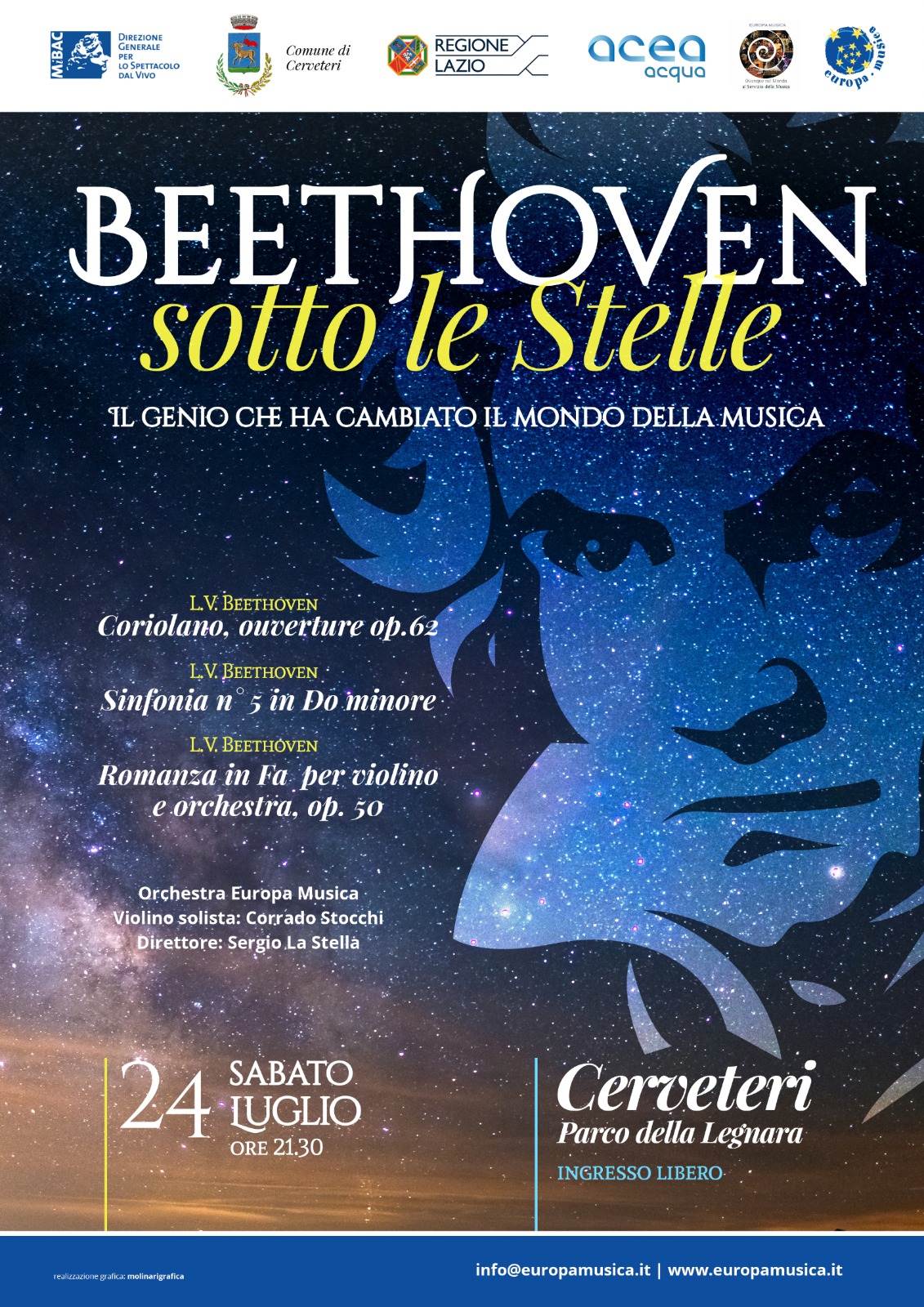 La meravigliosa orchestra di Europa Musica porta la genialità di Beethoven sotto le Stelle del Parco della Legnara a Cerveteri. Sabato 24 luglio, alle ore 21:30, un emozionante viaggio nella musica del grande musicista tedesco sotto la Direzione del Maestro Sergio La Stella e i virtuosismi del violino solista suonato dal Maestro Corrado Stocchi. Ingresso gratuito.