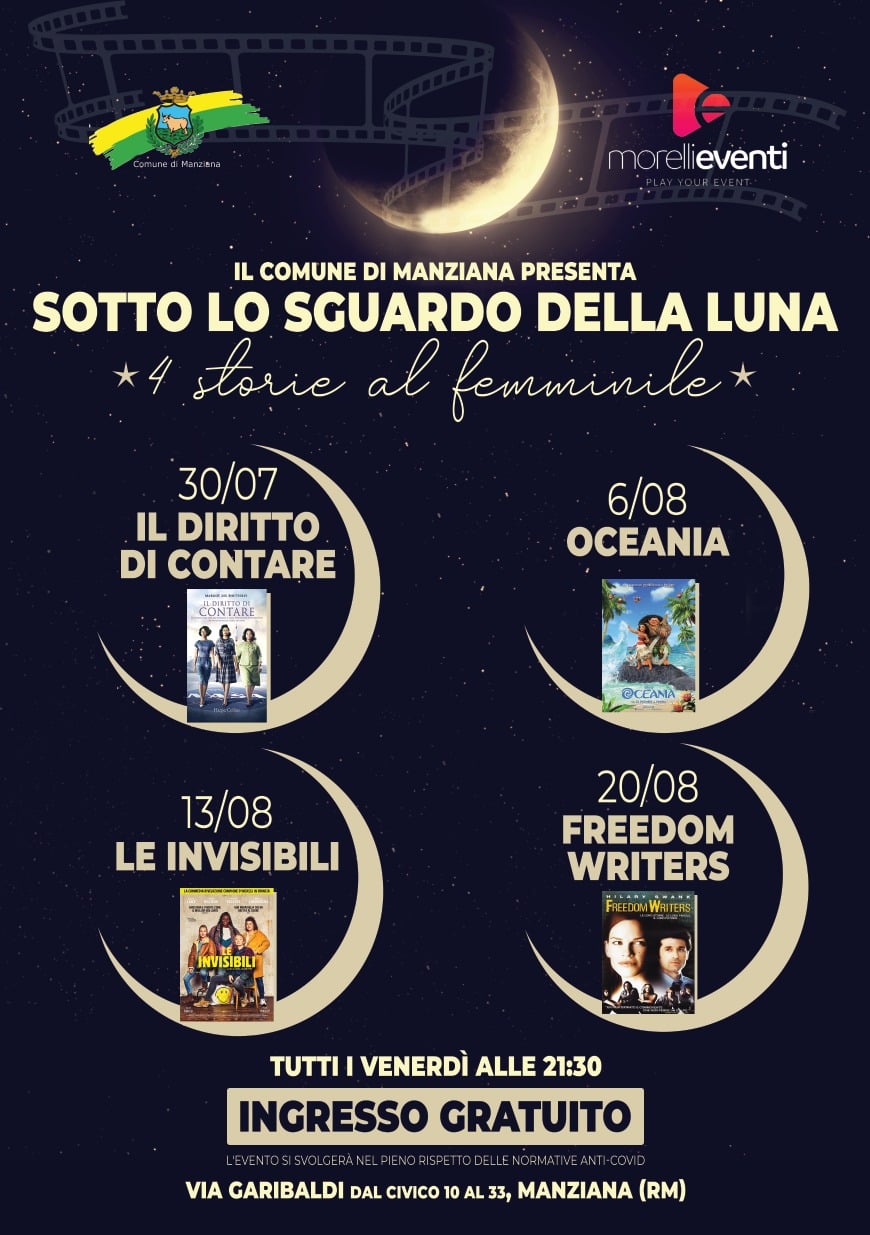 Dal 30 luglio al 20 agosto, ogni venerdì sera alle 21:30, a Manziana torna il cinema all’aperto con il calendario di proiezioni “Sotto lo sguardo della luna”.