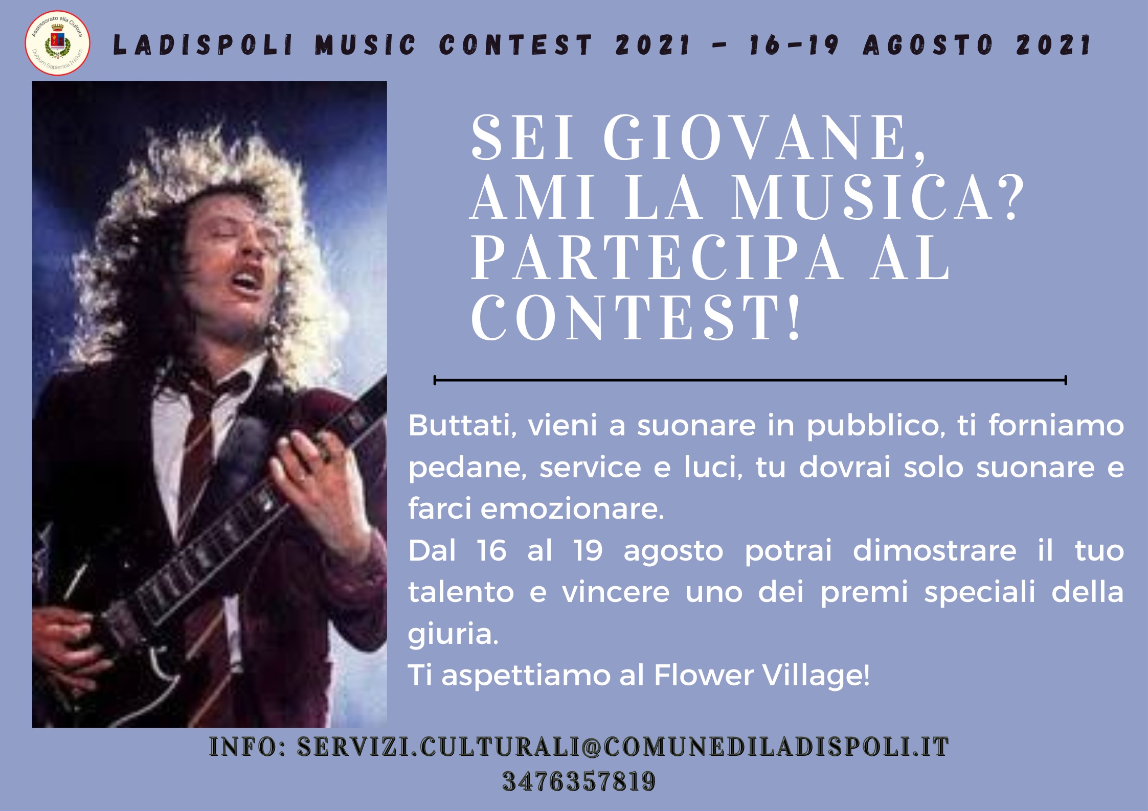 “Dal 16 al 19 agosto all’interno dei giardini Nazareno Fedeli, nell’ambito del Flower Village, si terrà un contest tra giovani (non solo d’età) musicisti, aperto a chiunque voglia partecipare. Non ci sono limiti di età né di genere musicale”. L’annuncio è dell’assessore alla cultura, Marco Milani.