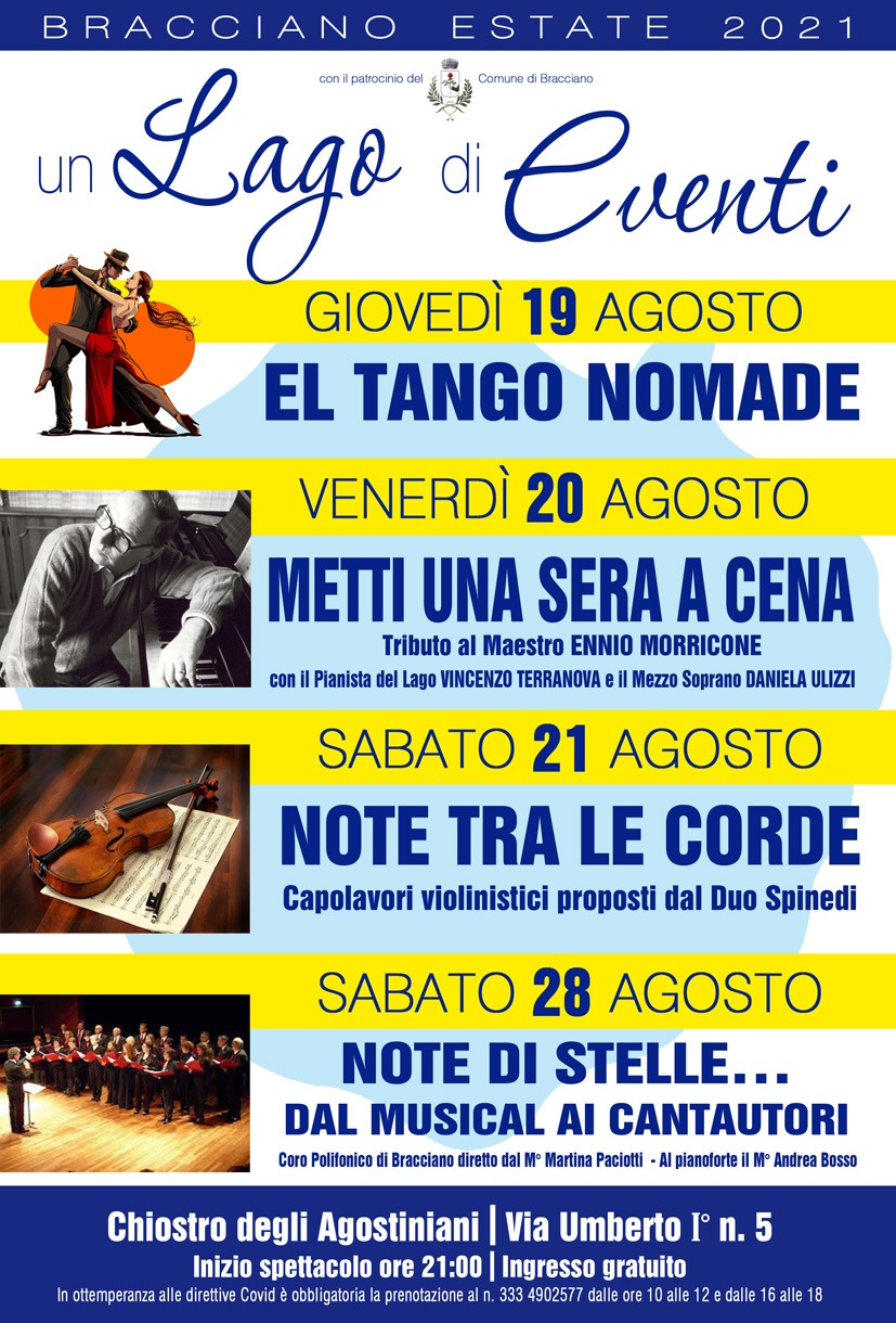 Ancora eventi a Bracciano con gli appuntamenti estivi al Chiostro Degli Agostiniani in via Umberto I con inizio alle ore 21 e ad ingresso gratuito. Giovedì 19 agosto c’è uno spettacolo tutto danzante con “El tango nomade”. Venerdì 20 agosto “Metti una sera a cena”, un tributo al Maestro Ennio Morricone con il Pianista del Lago Vincenzo Terranova e il Mezzo Soprano Daniela Ulizzi. Sabato 21 agosto “Note tra le corde”, capolavori violinistici proposti dal Duo Spinedi e sabato 28 agosto “Note di stelle” dal musical ai cantautori con l’esibizione del Coro Polifonico di Bracciano diretto dal Maestro Martina Paciotti, al pianoforte il Maestro Andrea Bosso. Il sindaco di Bracciano Armando Tondinelli si dice soddisfatto del calendario e iniziative culturali: “Anche quest’anno – ha dichiarato il Sindaco Tondinelli – abbiamo condiviso insieme con entusiasmo eventi di qualità che hanno intrattenuto la cittadinanza e i visitatori. Ringrazio l’Assessore alla Cultura Claudia Marini e il Direttore Artistico Antonio Pizzolla per l’impegno e la dedizione profusi. Invito tutti a partecipare anche a quest’altra settimana di eventi al Chiostro”
