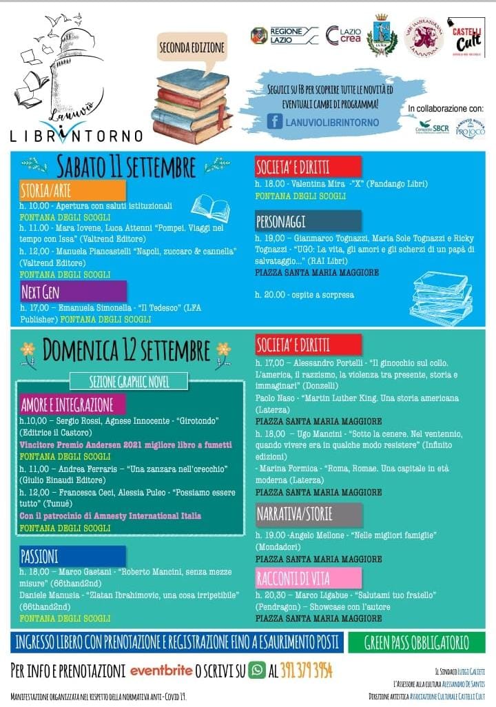 Dopo il successo dello scorso anno, torna, a Lanuvio, “Librintorno” la rassegna culturale organizzata dall’Assessorato alla Cultura del Comune di Lanuvio e dall’Associazione “Castelli Cult” con un finanziamento della Regione Lazio tramite il progetto “Lazio Crea” e in collaborazione con il consorzio S.C.R. e con la “Lanuvio Nuova Proloco”. L’evento, ricco di presentazioni e di incontri con gli autori, che si aprirà sabato 11 alle ore 10 con i saluti istituzionali durante i quali interverranno anche gli assessori alla cultura di diversi comuni dei castelli romani, si svolgerà in diversi luoghi della città e convoglierà diversi generi letterari dalla narrativa alla saggistica passando per la grafic novel. Molti i momenti di estremo interesse come ad esempio lo spazio NextGen dedicato ai giovani scrittori che vedrà la presentazione del libro “il Tedesco” dell’autrice lanuvina Emanuela Simonella o la sezione Graphic Novel con la presentazione di “Girotondo”, il libro di Sergio Rossi e Agnese Innocente, che ha ricevuto il Premio Andersen 2021. Spazio poi alla saggistica, allo sport, al cinema e alla musica con i due eventi serali che vedranno, nella serata di sabato, un omaggio al grande Ugo Tognazi con la presentazione del libro “UGO: la vita, gli amori e gli scherzi di un papà di salvataggio…” mentre nella serata di domenica sarà la volta di Marco Ligabue, fratello di Luciano, che in un vero e proprio showcase presenterà il suo libro dal titolo abbastanza emblematico “Salutami tuo fratello”.
