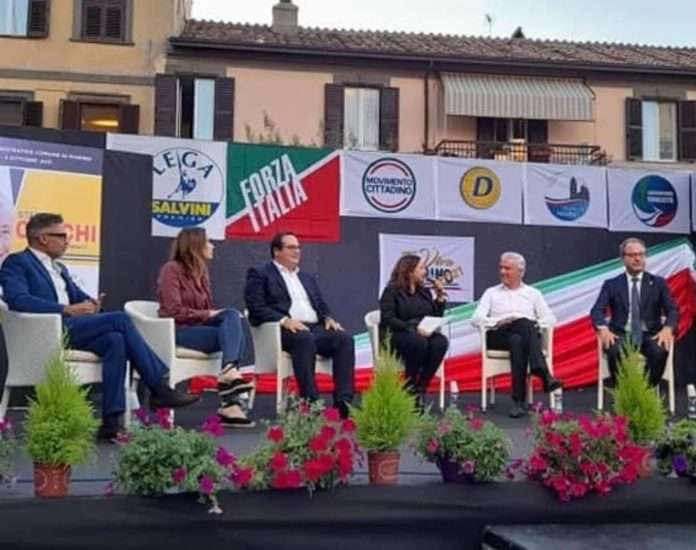 Si è svolta a Marino la manifestazione “Diciamolo in piazza” organizzata dalla coalizione “Evviva Marino” per Stefano Cecchi sindaco. Tanti gli esponenti politici locali e nazionali presenti e grande è stata la partecipazione dei cittadini. All’evento hanno partecipato Lucia Borgonzoni, sottosegretario alla Cultura, Francesco Paolo Sisto, sottosegretario alla Giustizia, Giorgio Mulè, sottosegretario alla Difesa, Claudio Durigon, Coordinatore Lega Lazio, Alfredo Becchetti, coordinatore Lega Roma, Alessandro Battilocchio, coordinatore provinciale di Forza Italia.