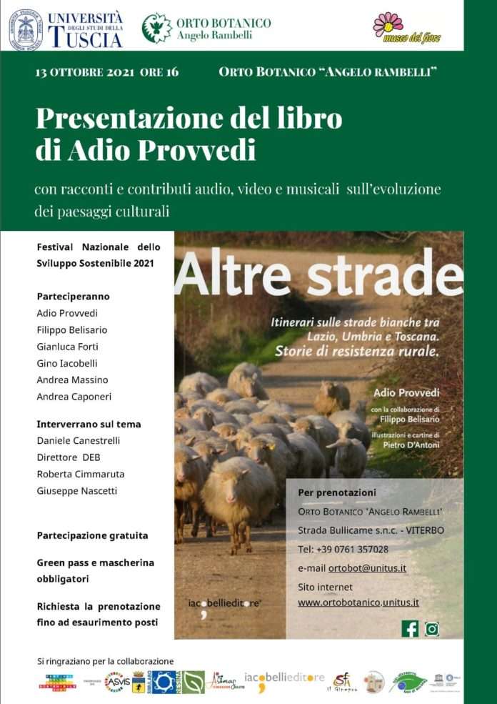 È in programma mercoledì 13 ottobre 2021 alle ore 16 a Viterbo, presso l’Orto Botanico “Angelo Rambelli” dell’Università della Tuscia (Strada Bullicame), la presentazione del libro “Altre strade. Itinerari sulle strade bianche tra Lazio, Umbria e Toscana, Storie di resistenza rurale” di Adio Provvedi, pubblicato da Iacobelli editore, realizzato con la collaborazione di Filippo Belisario e con illustrazioni e mappe di Pietro d’Antoni.