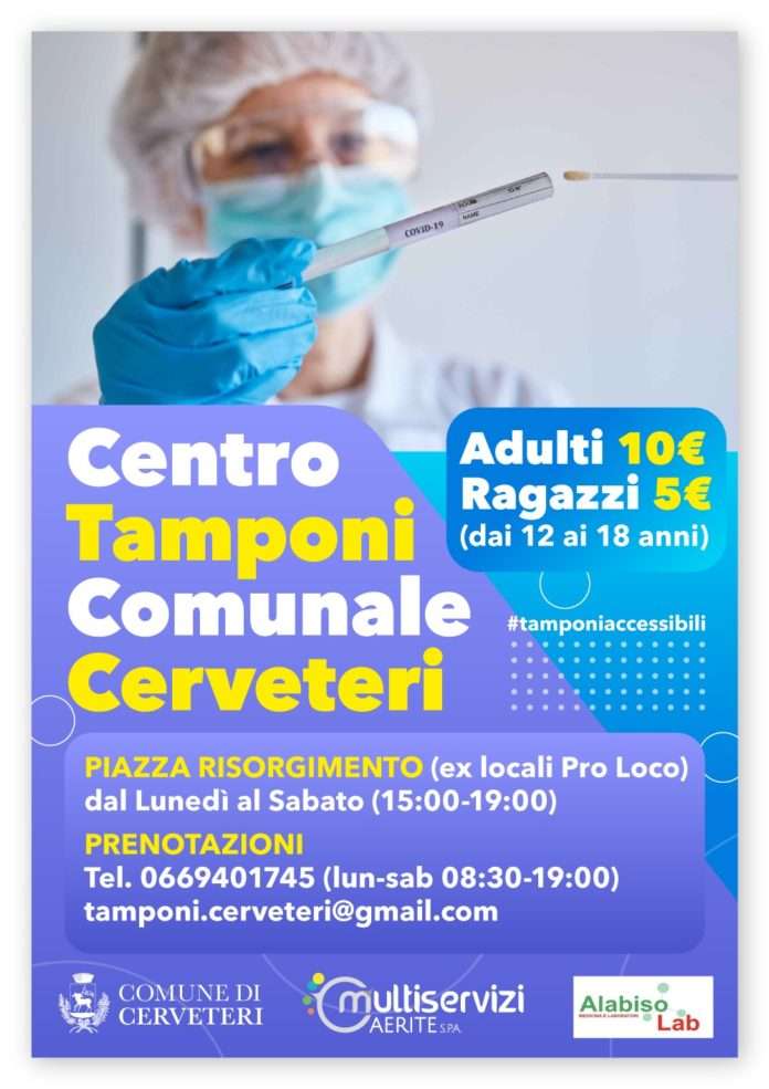 Il Comune di Cerveteri, insieme alla Multiservizi Caerite che gestisce le farmacie comunali e la Alabiso Lab, ha attivato a partire da lunedì 18 ottobre in Piazza Risorgimento (all’interno dei locali della ex Pro Loco), un Centro Tamponi Comunale, aperto 6 giorni su 7, dal lunedì al sabato, dalle ore 15 alle ore 19.