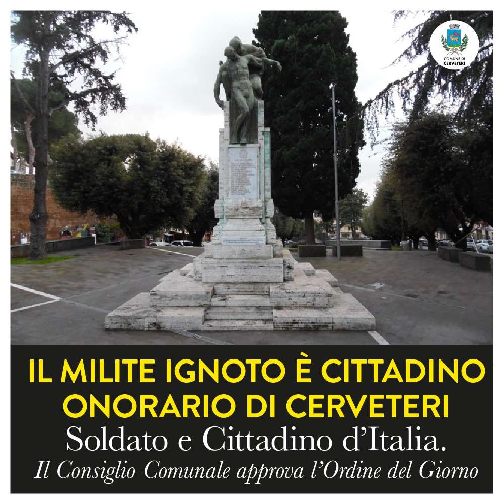 Il Consiglio comunale di Cerveteri, riunitosi in data odierna, ha concesso la Cittadinanza Onoraria al Milite Ignoto. Il Sindaco di Cerveteri ha infatti accolto la proposta promossa dal Gruppo delle Medaglie d’Oro al Valor Militare d’Italia, portando all’approvazione della massima assise cittadina, il riconoscimento, in occasione del centenario dalla traslazione all’Altare della Patria, avvenuto il 4 Novembre del 1921, del titolo di Soldato e Cittadino d’Italia.