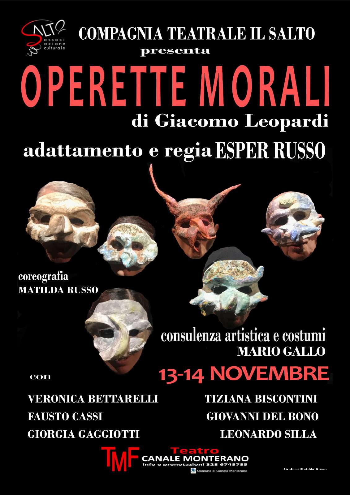Sabato 13 novembre alle 21 e domenica 14 alle 18 il teatro comunale di Canale Monterano ospita le “Operette morali” di Giacomo Leopardi, spettacolo suggestivo e comunicativo curato dalla compagnia teatrale “Il Salto” con l’adattamento e la regia di Esper Russo e la consulenza artistica e i costumi di Mario Gallo. In scena Veronica Bettarelli, Fausto Cassi, Tiziana Biscontini, Giovanni Del Bono, Giorgia Gaggiotti e Leonardo Silla, la coreografia è di Matilda Russo. Le “Operette Morali” rappresentano un vero e proprio capolavoro leopardiano, un lavoro innovativo, che mette in scena i personaggi fantastici e i dialoghi filosofici di Leopardi, come se fosse un racconto fiabesco, dove maschere, danza e costumi ci trasportano in situazioni metafisiche.