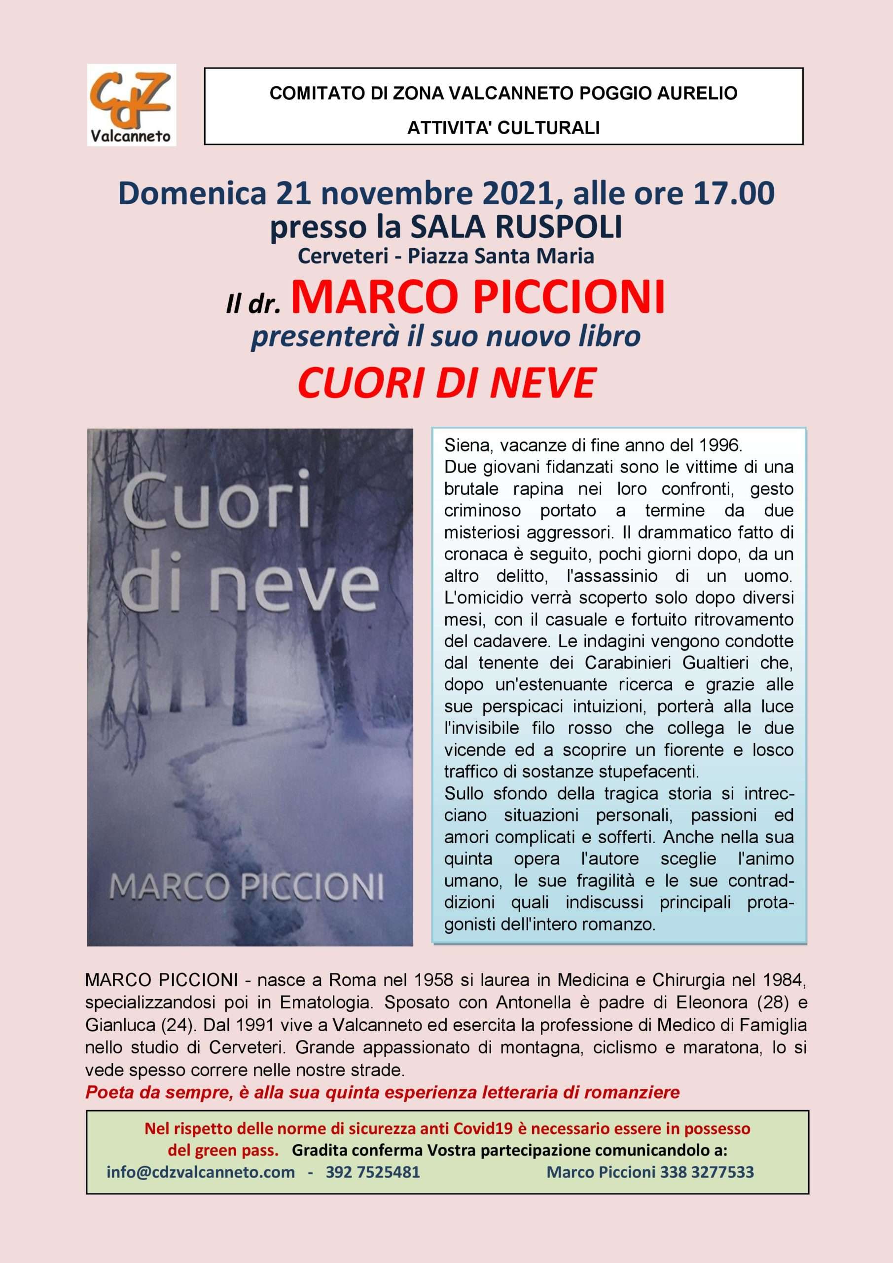 Domenica 21 novembre alle ore 17:00 a Sala Ruspoli uno stimato e apprezzato cittadino di Cerveteri presenterà il suo nuovo libro. Si tratta del Dottor Marco Piccioni, medico di base, che presenterà “Cuori di Neve”. L’evento, patrocinato dall’Assessorato alle Politiche Culturali del Comune di Cerveteri, è organizzato con il Comitato di Zona Valcanneto.