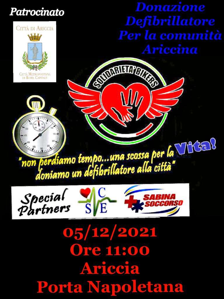 Domani, domenica 5 dicembre, l’Associazione “Solidarietà Bikers” donerà alla città di Ariccia un defibrillatore per renderlo un comune cardio protetto. L’appuntamento per la consegna del defibrillatore è fissato per le ore 11 a Porta Napoletana.