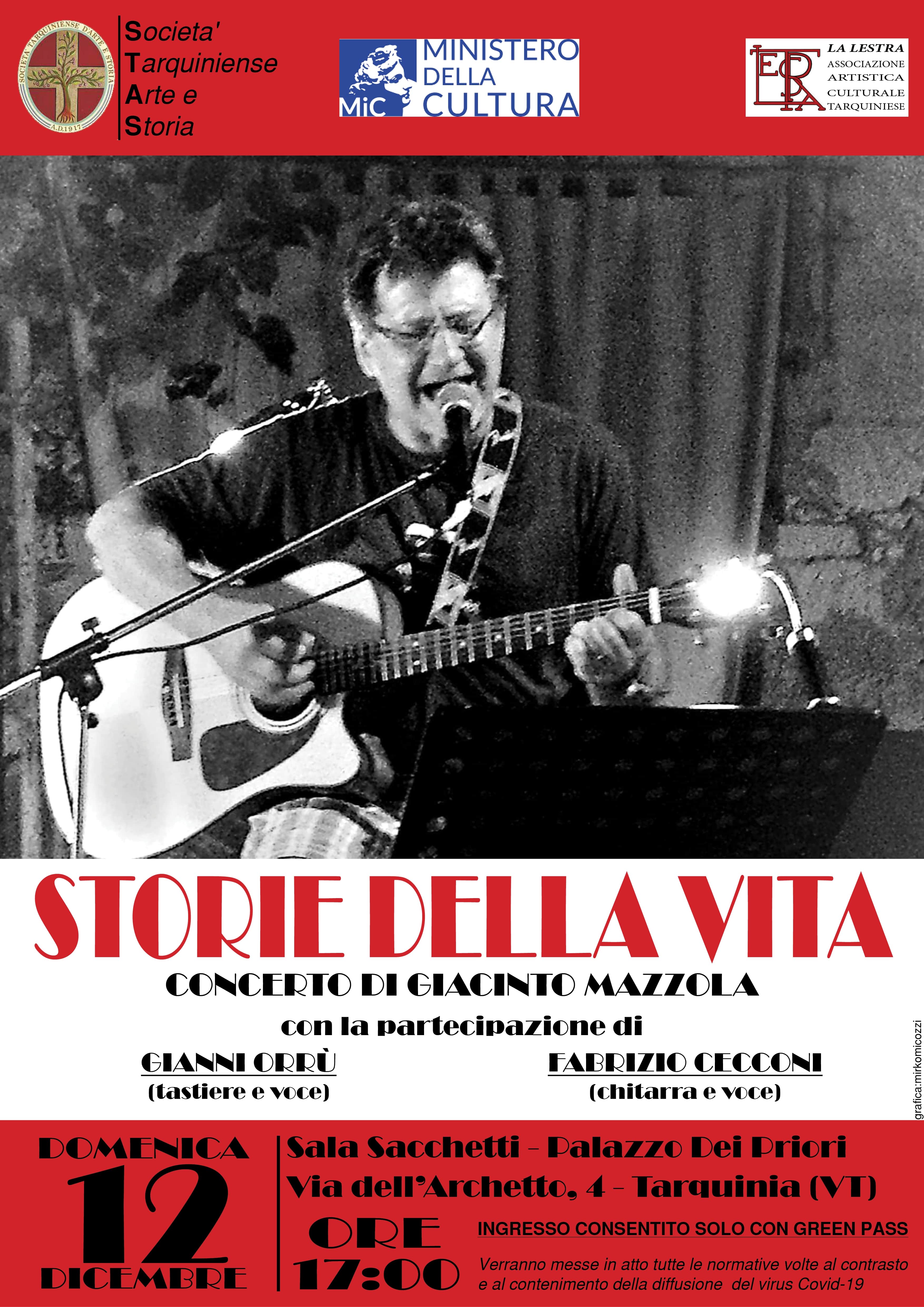 Alla sala Sacchetti di palazzo dei Priori, a Tarquinia, domenica 12 dicembre, alle ore 17, si svolgerà il concerto “Storie della Vita” di Giacinto Mazzola, con la partecipazione di Gianni Orrù (tastiere e voce) e Fabrizio Cecconi (chitarra e voce). Organizzato dalla Società Tarquiniense d’Arte e Storia, in collaborazione con l’associazione La Lestra, lo spettacolo è reso possibile grazie al sostegno del Ministero della Cultura. “Il concerto racchiude solo alcune delle molte storie che ho scritto da quando ero ragazzino – afferma Giacinto Mazzola -. Nella mia vita ho avuto l’opportunità di fare molti concerti specialmente a Milano, da solo o avvalendomi della collaborazione di altri musicisti, come in questo caso”. Le canzoni raccontano storie di vita quotidiana: storie immaginate e scritte, colte da ciò che accade o è accaduto nel tempo intorno all’artista. Ispirate al vissuto altrui e al suo personale. Alcuni brani sono stati già presentati Lestra in un precdente concerto al mattatoio organizzato dall’associazione La Lestra. “Finalmente dopo questo periodo di lungo digiuno, causato dal covid – conclude Giacinto Mazzola -, posso ritornare a raccontarle”. Per il concerto saranno messe in atto tutte le normative volte al contrasto e al contenimento del covid 19. L’ingresso, gratuito, sarà consentito solo tramite presentazione di green pass rafforzato.