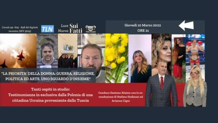tematico settimanale, ideato e condotto da Gaetano Alaimo ed in onda ogni giovedì sera dalle 21 su Tele Lazio Nord, sarà dedicato nella prossima puntata ad approfondire temi specifici della guerra in Ucraina, in particolar modo il ruolo delle donne coinvolte e sul loro coraggio e alla Festa della Donna. La puntata avrà infatti il titolo “La priorità della donna: guerra, religione, politica e arte. Uno sguardo d’insieme”. Condurrà Gaetano Alaimo con i co-conduttori Arianna Cigni e Stefano Stefanini.