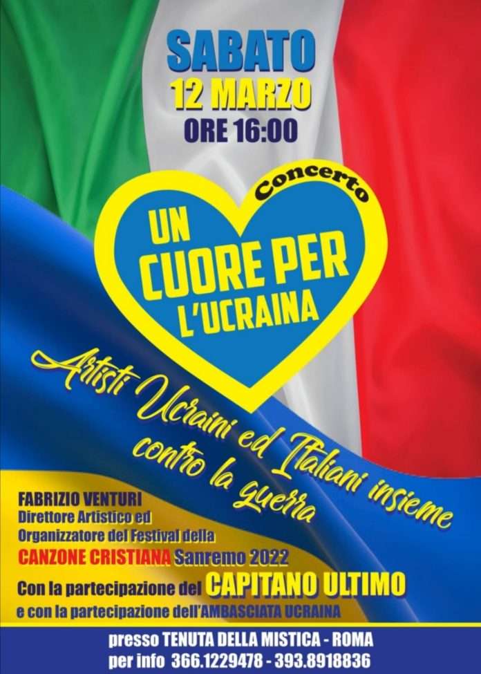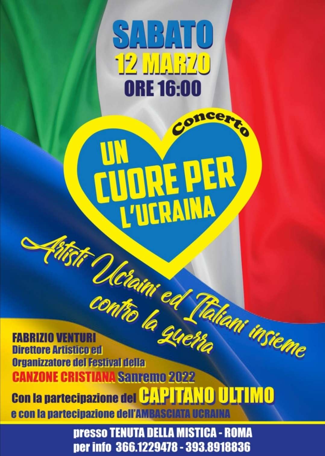 Il Cantautore e Direttore artistico Fabrizio Venturi ha organizzato il concerto per la pace “Un cuore per l’Ucraina” contro la guerra dichiarata dalla Russa all’Ucraina, che si terrà a Roma, sabato 12 marzo 2022, alle ore 16.00, nella Tenuta della Mistica “Capitano Ultimo”, sita in via della Tenuta Mistica. Fabrizio Venturi è, inoltre, il Direttore artistico ed organizzatore del Festival della Canzone Cristiana Sanremo 2022, che si è tenuto a Sanremo il 3, 4 e 5 febbraio 2022, con il Patrocinio del Comune di Sanremo, della Diocesi di Ventimiglia e Sanremo e della S.I.A.E.