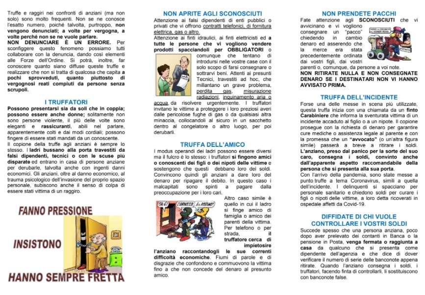 I Carabinieri illustrano le principali tecniche e i raggiri usati dai malfattori per entrare nelle case, spiegando come poter fronteggiare i rischi e quale comportamento assumere in caso di situazioni sospette, distribuendo a tal proposito un volantino informativo.