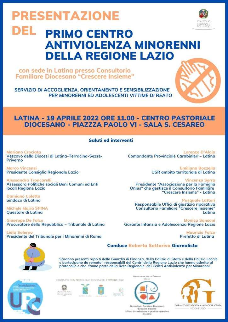 Tanti gli ospiti che prenderanno parte all’evento di inaugurazione, moderato dalla giornalista Roberta Sottoriva, a cominciare dalla Dott.ssa Monica Sansoni (Garante per l’Infanzia e l’Adolescenza della Regione Lazio), oltre a Mariano Crociata (Vescovo della Diocesi Latina-Terracina-Sezze-Priverno), Marco Vincenzi (Presidente del Consiglio Regionale del Lazio), Alessandra Troncarelli (Assessora Politiche sociali Beni Comuni ed Enti locali Regione Lazio), Damiano Coletta (Sindaco di Latina), Michele Maria Spina (Questore di Latina), Giuseppe De Falco (Procuratore della Repubblica – Tribunale di Latina), Lidia Salerno (Presidente del Tribunale per i Minorenni di Roma), Lorenzo D’Aloia (Comandante Provinciale Carabinieri – Latina), Emiliana Bozzella (USR ambito territoriale di Latina), Vincenzo Serra (Presidente  “Associazione per la Famiglia Onlus”), Pasquale Lattari (Responsabile Uffici di giustizia riparativa Consultorio Familiare “Crescere Insieme” Latina) e Maurizio Falco (Prefetto di Latina).