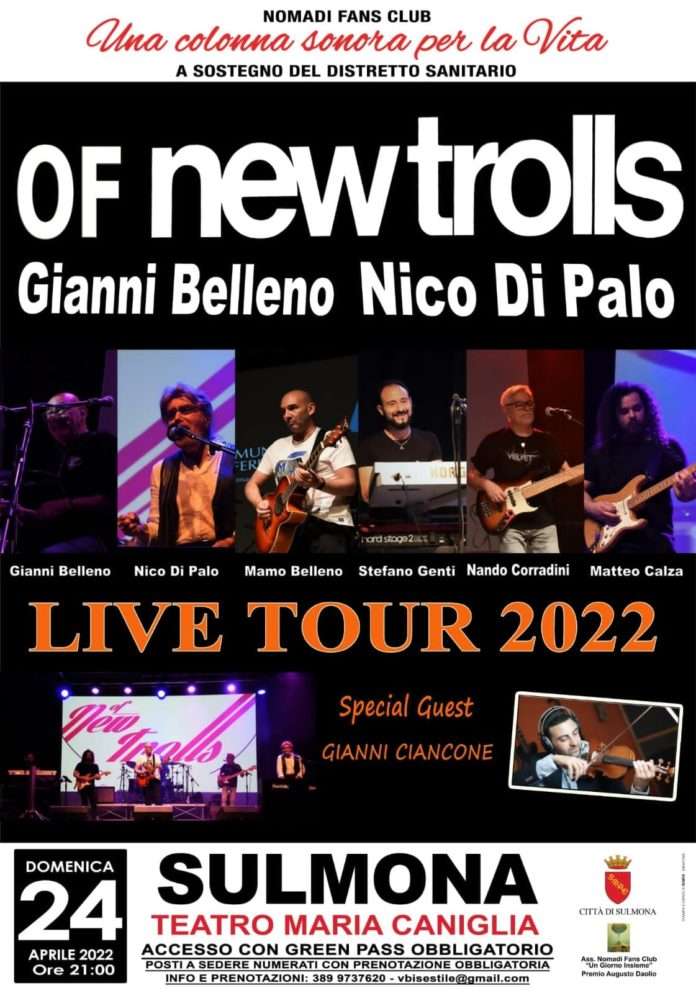 Domenica 24 aprile 2022, alle ore 21, al Teatro comunale di Sulmona (L’Aquila), si terrà il concerto di beneficenza degli Of New Trolls, formazione guidata dai membri fondatori Gianni Belleno e Nico Di Palo, e con la partecipazione del musicista abruzzese Gianni Ciancone al violino per “Concerto Grosso”. La band presenterà il recente doppio album “Le Radici E il viaggio continua”, che contiene undici nuovi brani e sei brani storici riarrangiati e riregistrati.
