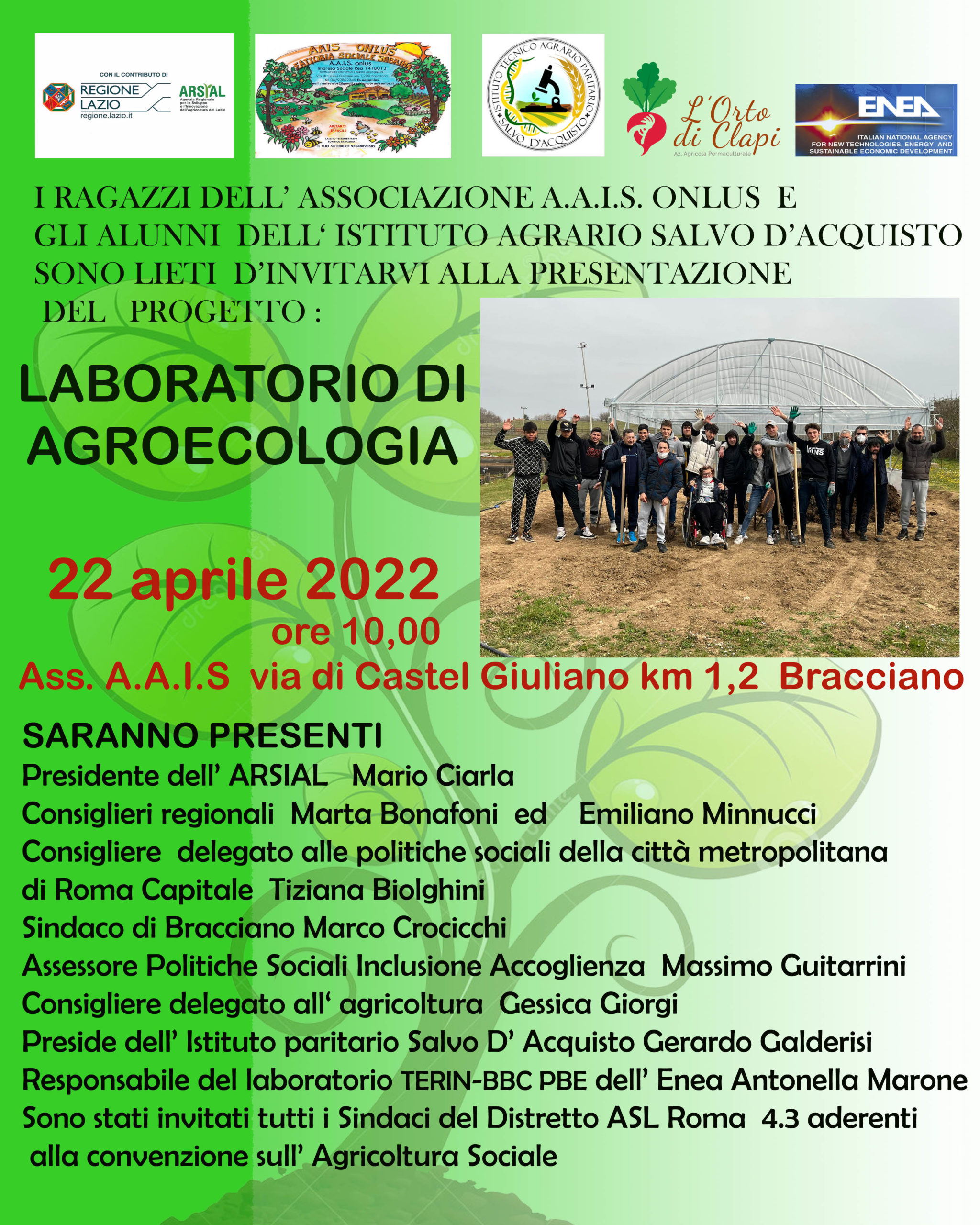 Il 22 alle 10 si svolgerà nel centro diurno in fattoria sociale dell’ Ass. AAIS onlus a Castel Giuliano la presentazione del progetto “Laboratorio di agroecologia” finanziato dall’ Arsial e supervisionato dal dott. Mariotti. Il progetto sarà presentato dai ragazzi dell’ Associazione AAIS onlus e gli alunni della classe 4 dell’ Istituto Agrario Salvo D’ Acquisto.Tale progetto oltre ad essere un laboratorio esperenziale che include giovani adolescenti e persone con disabilità ha una valenza formativa sui temi dell’ agricoltura sinergica e del cambiamento climatico . Gli agronomi Angelo Correnti dell’ ente Enea Casaccia e Lorenzo Clapi docenti del progetto esporranno la parte tecnica e innovativa del laboratorio di agroecologia che mira sempre di più ad una produzione sana ed ecosostenibile..