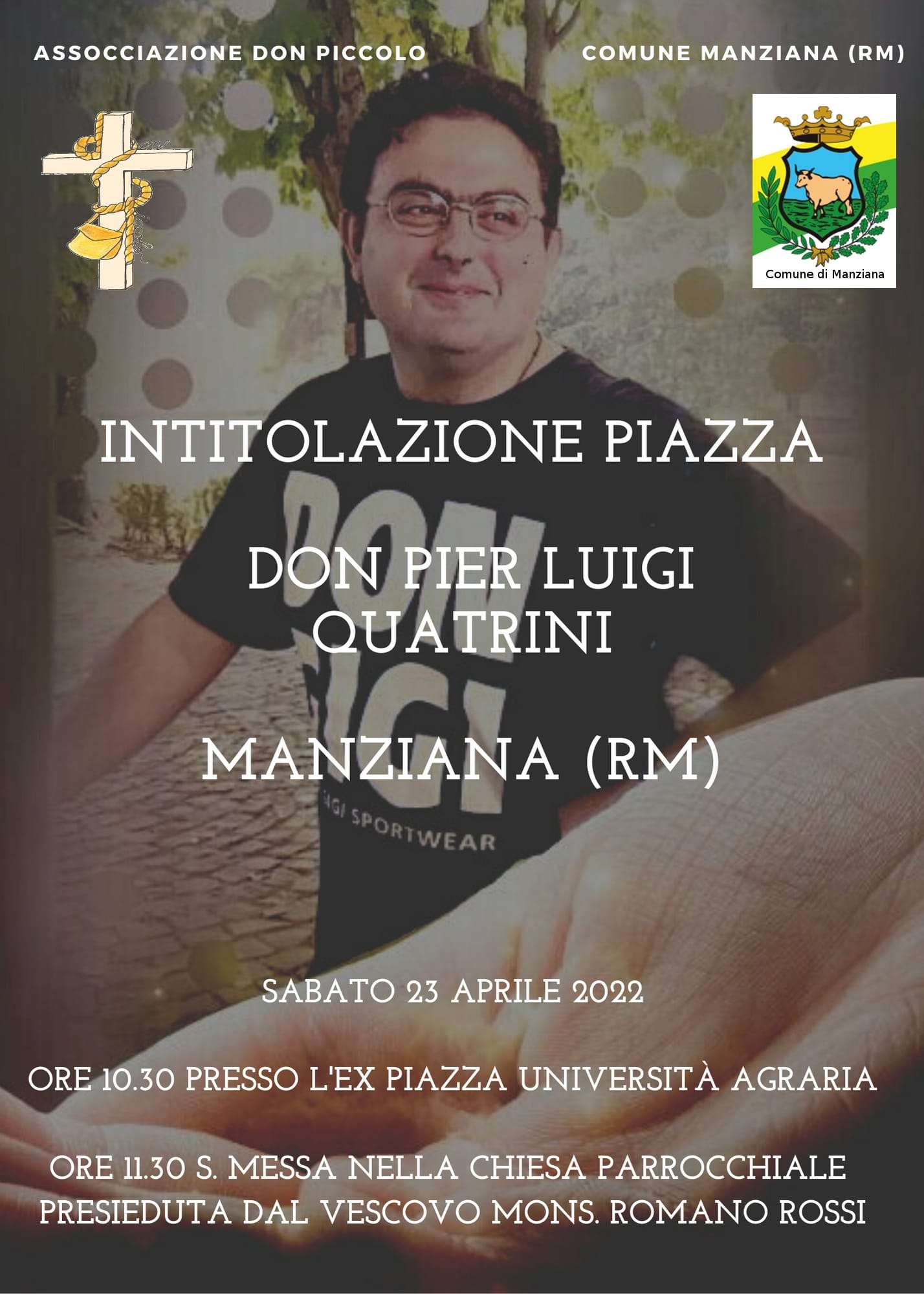Domani, sabato 23 aprile, alle10 e 30, si terrà la cerimonia di intitolazione di una piazza a don Pierluigi Quatrini. A seguire, alle 11:30 presso la Chiesa di San Giovanni Battista, sarà celebrata la messa presieduta dal Vescovo Mons. Romano Rossi.