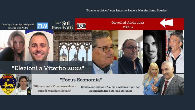 L’appuntamento è per giovedì 21 aprile alle 21 (ed in replica venerdì 22 aprile alle 14.30) per la 28° puntata di “Luce Nuova sui fatti”, che andrà in onda su Tele Lazio Nord (canali 94, 629, 848 Dtt e 5629 Sky), su Tro1 (canale 71 Dtt, il giovedì alle 22) e Tro2