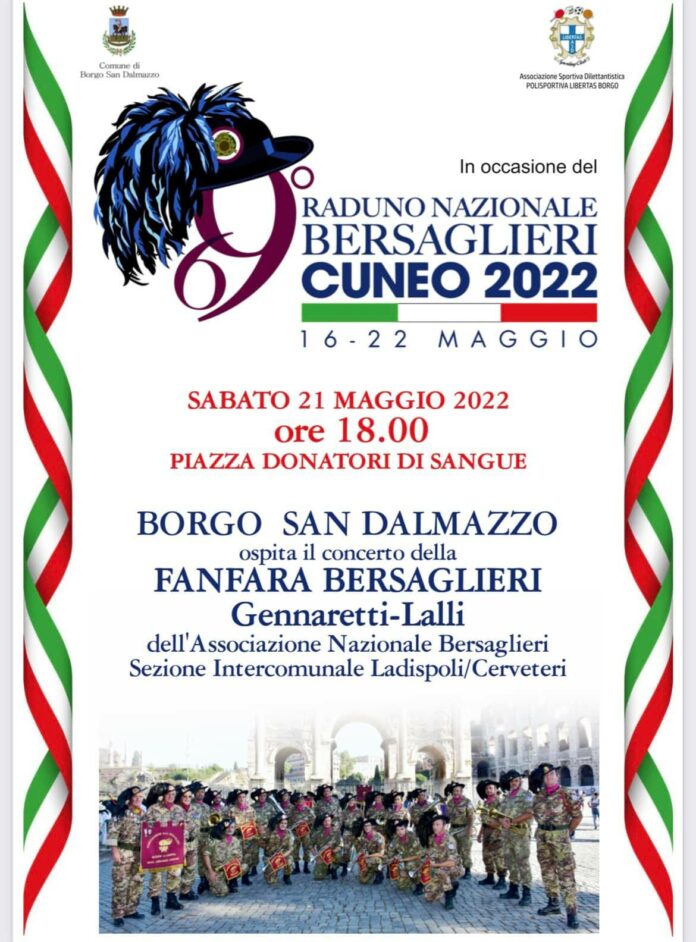 Dal 16 al 22 maggio a Cuneo si terrà il 69esimo Raduno Nazionale dei Bersaglieri. In tale occasione, sarà presente anche Cerveteri con la sezione Intercomunale Ladispoli/Cerveteri e che sabato 21 maggio sarà in concerto a Borgo San Dalmazio con la Fanfara Gennaretti – Lalli.