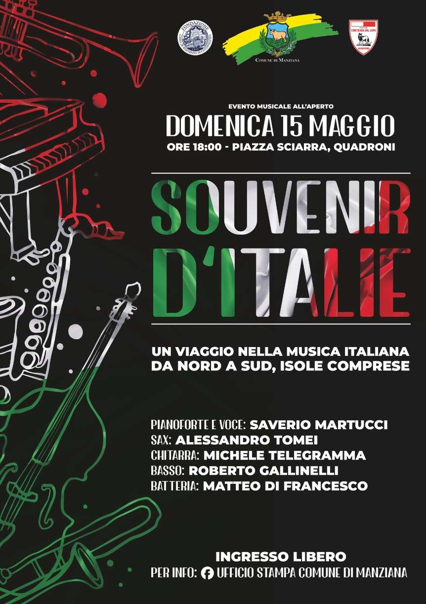 Domenica 15 maggio, alle ore 18, in Piazza Sciarra il Comune di Manziana e la Contrada del Lupo, con il contributo della Fondazione Cassa di Risparmio di Civitavecchia, presentano il concerto “Souvenir d’Italie” un viaggio alla scoperta della musica italiana, da nord a sud, isole comprese. L’evento si terrà all’aperto ed è ad ingresso libero.